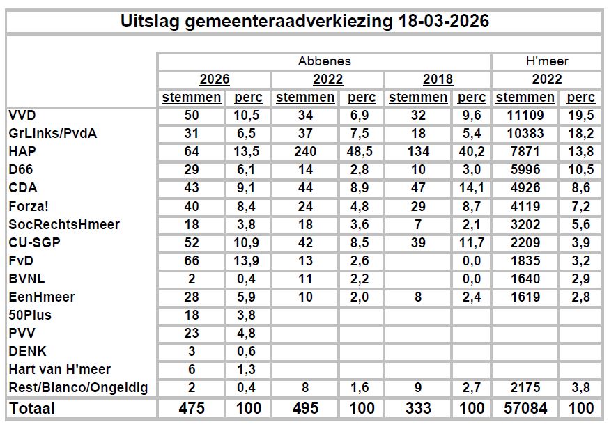 19-03: Uitslag van de gemeenteraadsverkiezingen 2026 van Abbenes, met dank aan Theo Hoogkamer