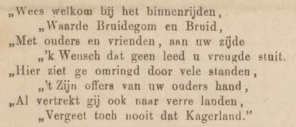 Werkelijk heeft dit plaats gehad, ondanks het niet al te vriendelijke weder. Na een kort bezoek aan den Leeghwater ging Bruid en Bruidegom, omstreeks één uur, met een talrijk gevolg door de sierlijke eerepoort, die heenleidde naar een der bouwhoeven van den heer Dyserinck. Behalve het vele groen en de fraaije bloemen der eerepoort, trok ook het onderstaande vers de aandacht: